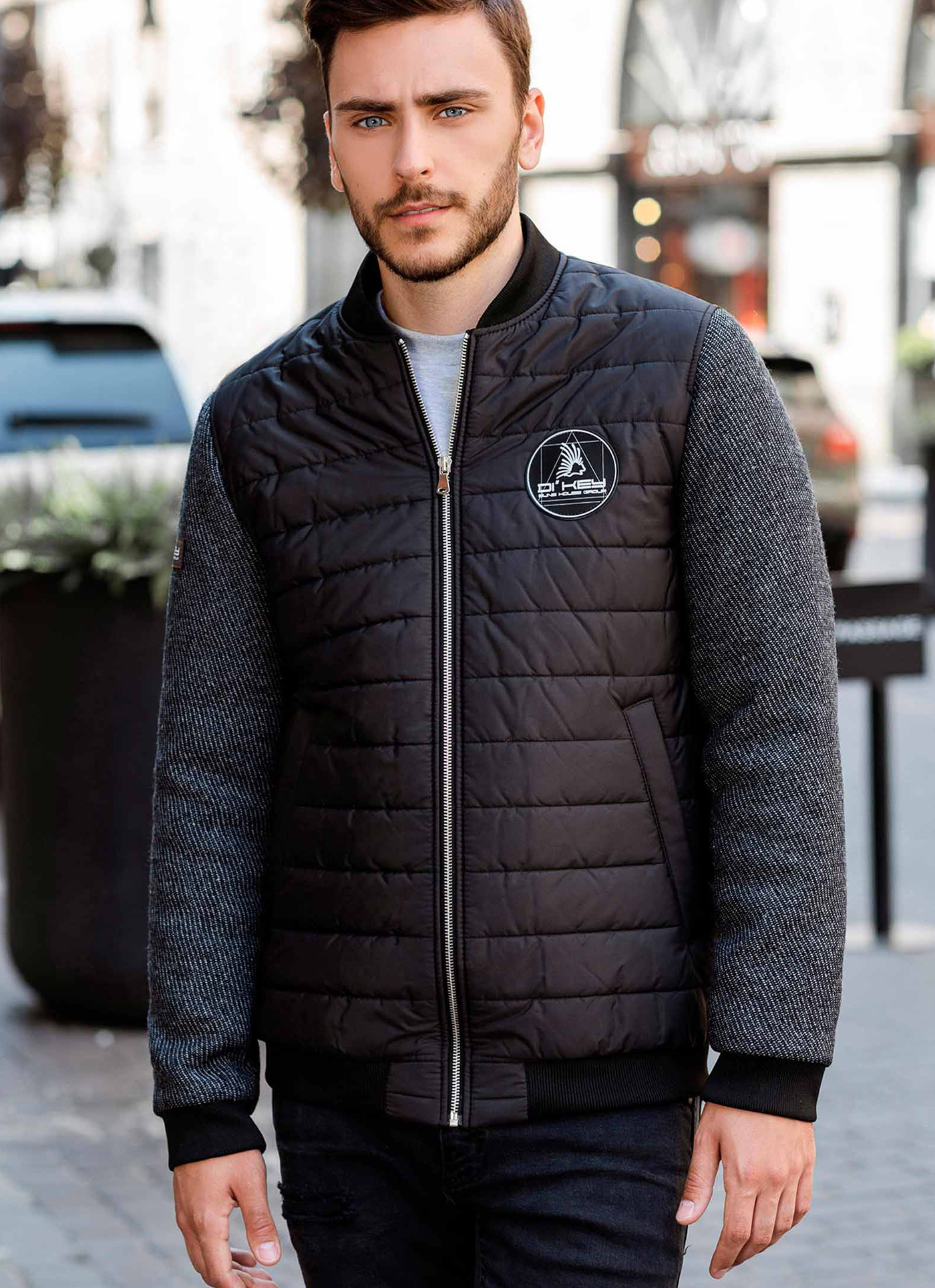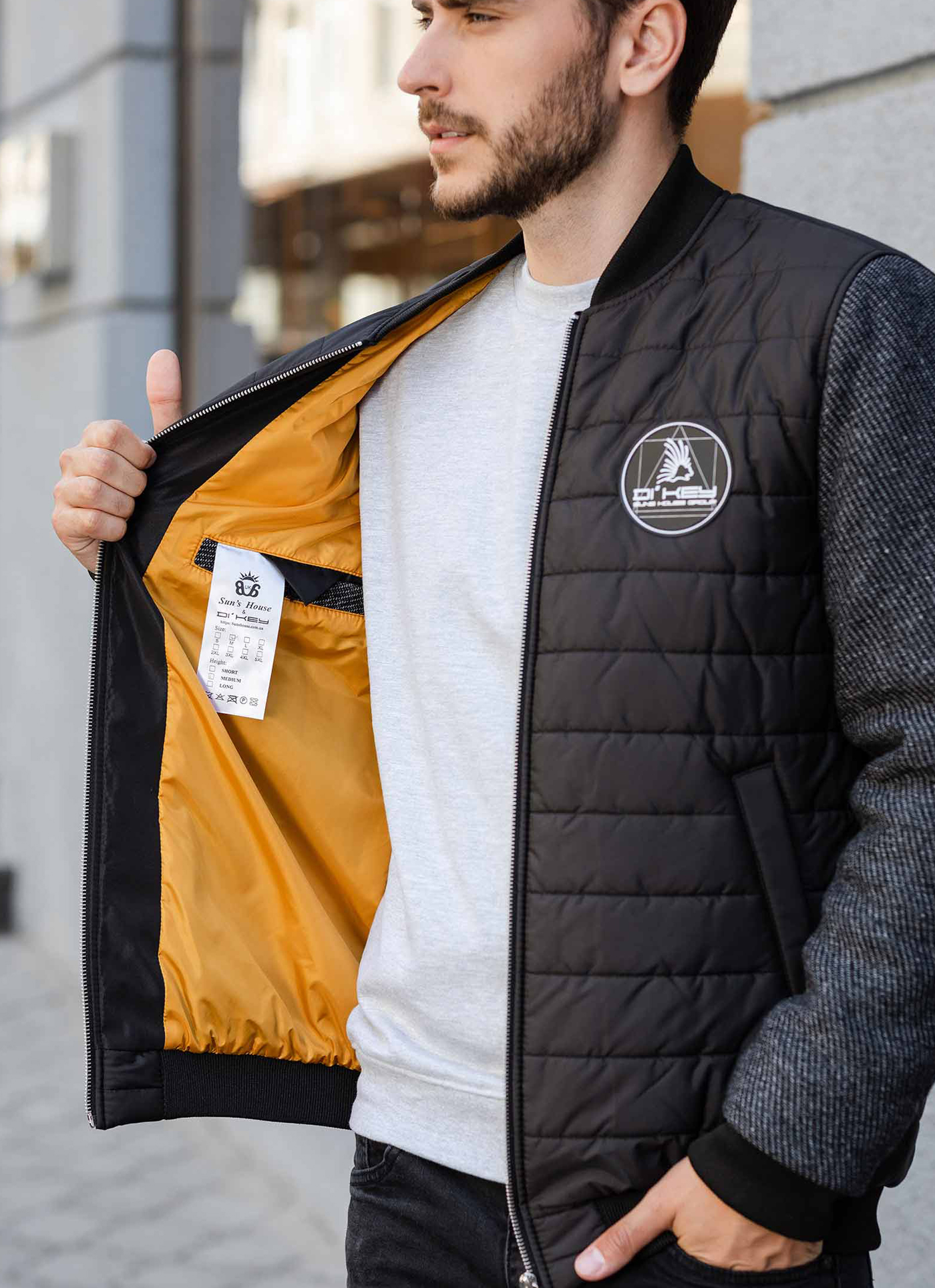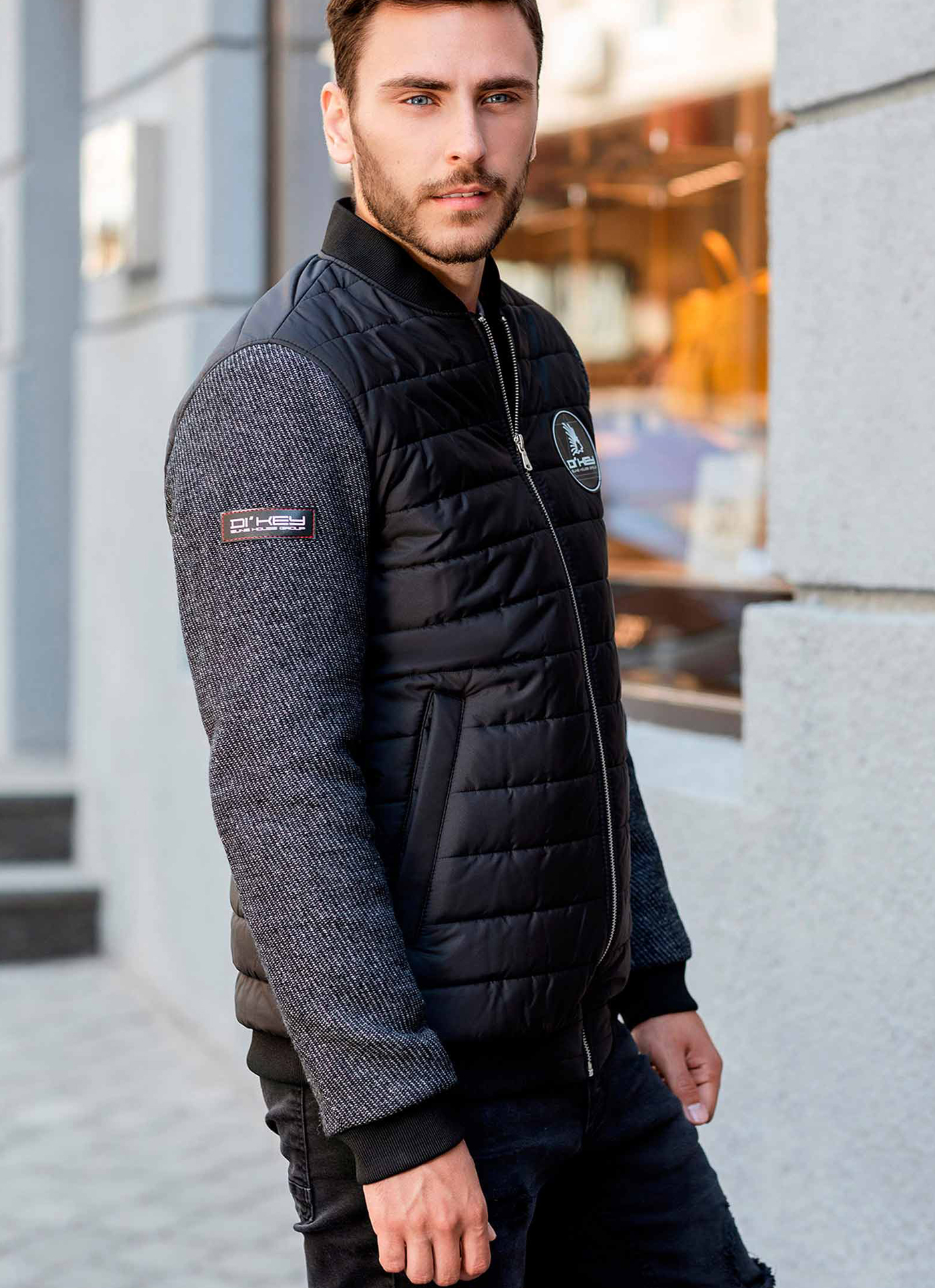Практична куртка Бомбер, чорного кольору, стильна і приваблива, яка користується великим попитом серед активних і цілеспрямованих чоловіків, комбінована різними тканинами рукава (натуральна вовна), та основної тканини Polynosic, а також стилні трикотажні рукавні манжети, пояс та горловина, 2 бокові кишені та 2 внутрішні.