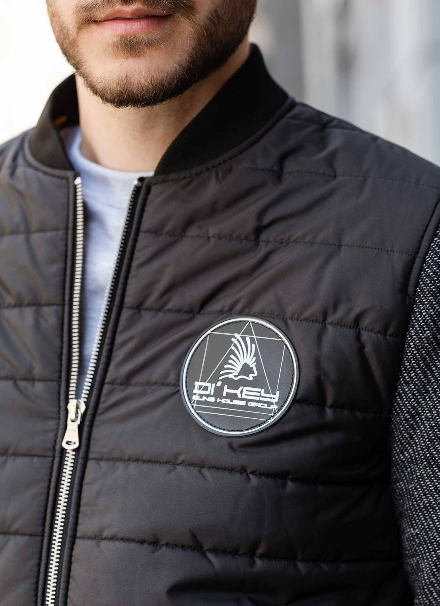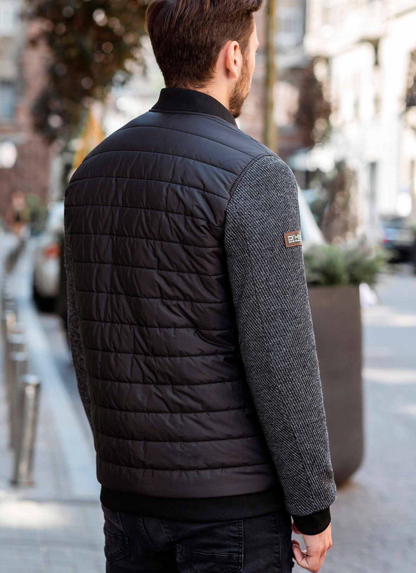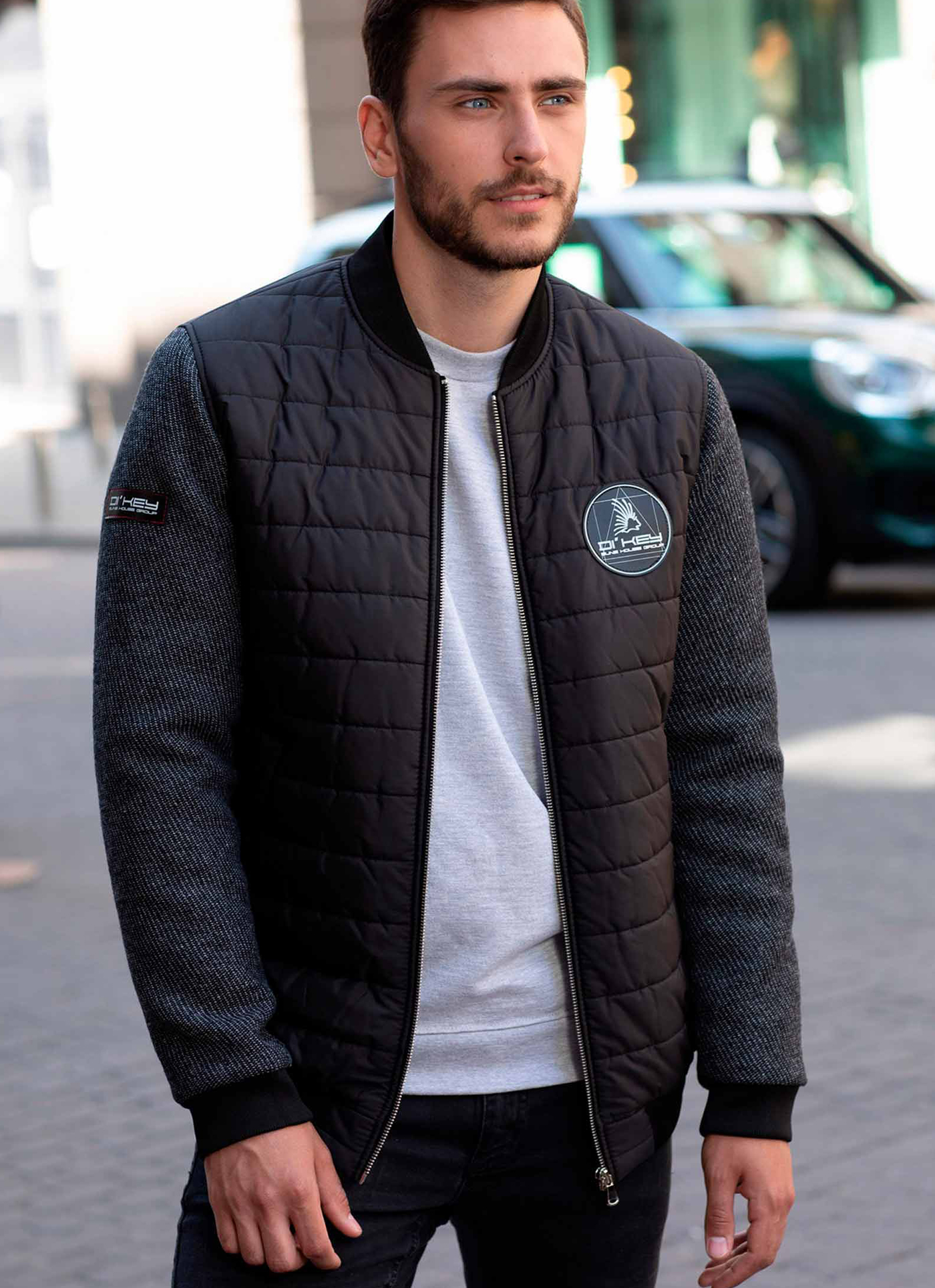 Практична куртка Бомбер, чорного кольору, стильна і приваблива, яка користується великим попитом серед активних і цілеспрямованих чоловіків, комбінована різними тканинами рукава (натуральна вовна), та основної тканини Polynosic, а також стилні трикотажні рукавні манжети, пояс та горловина, 2 бокові кишені та 2 внутрішні.
