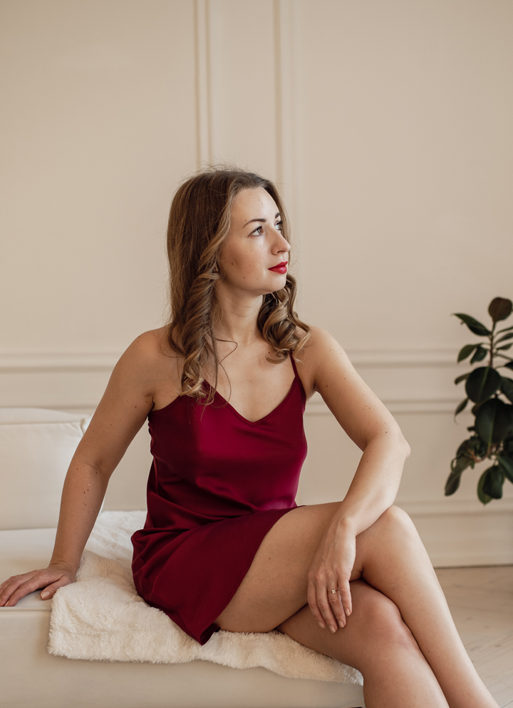 Комбінація жіноча бордова вище коліна, що підкреслює жіночність фігури, з регульованими бретелями.