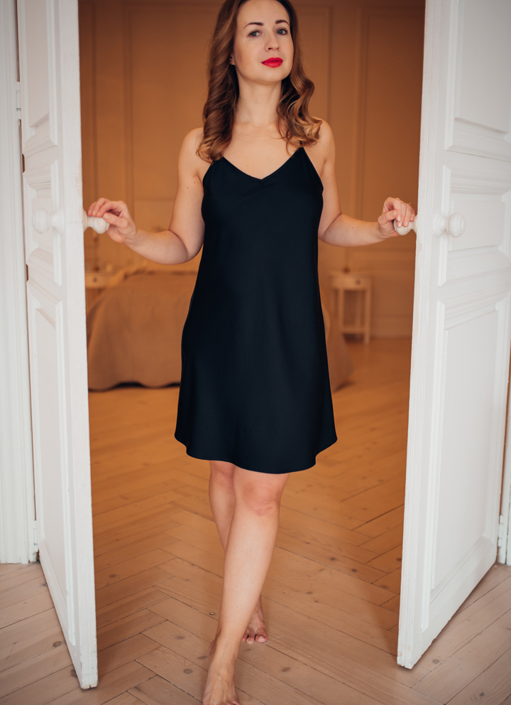 Комбінація жіноча справжнього чорного кольору вище коліна, що підкреслює жіночність фігури, з регульованими бретелями.