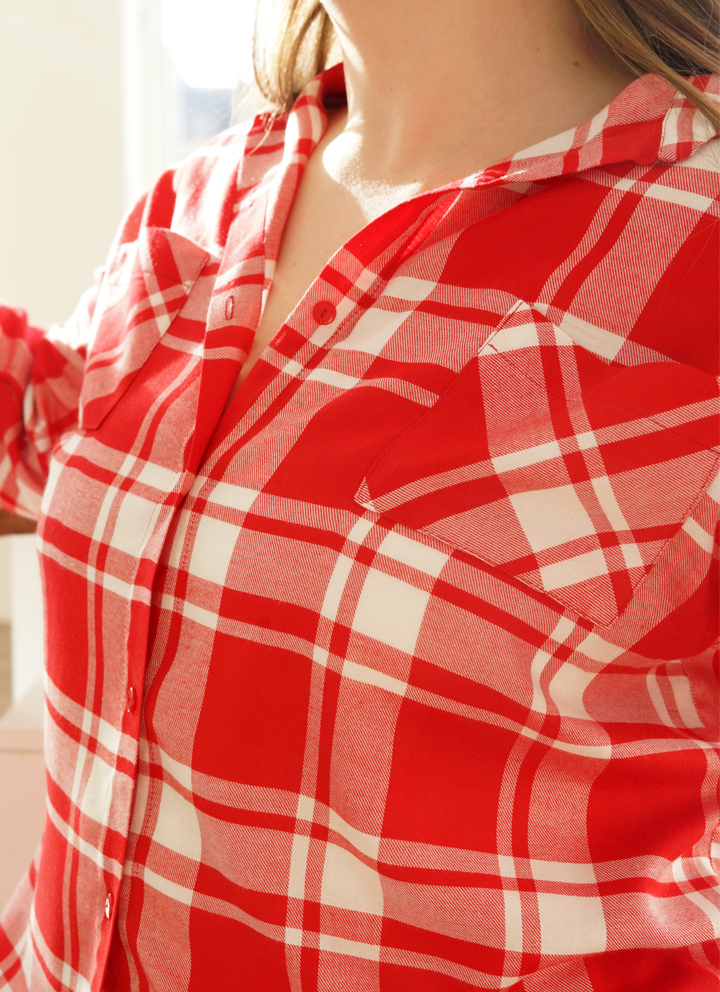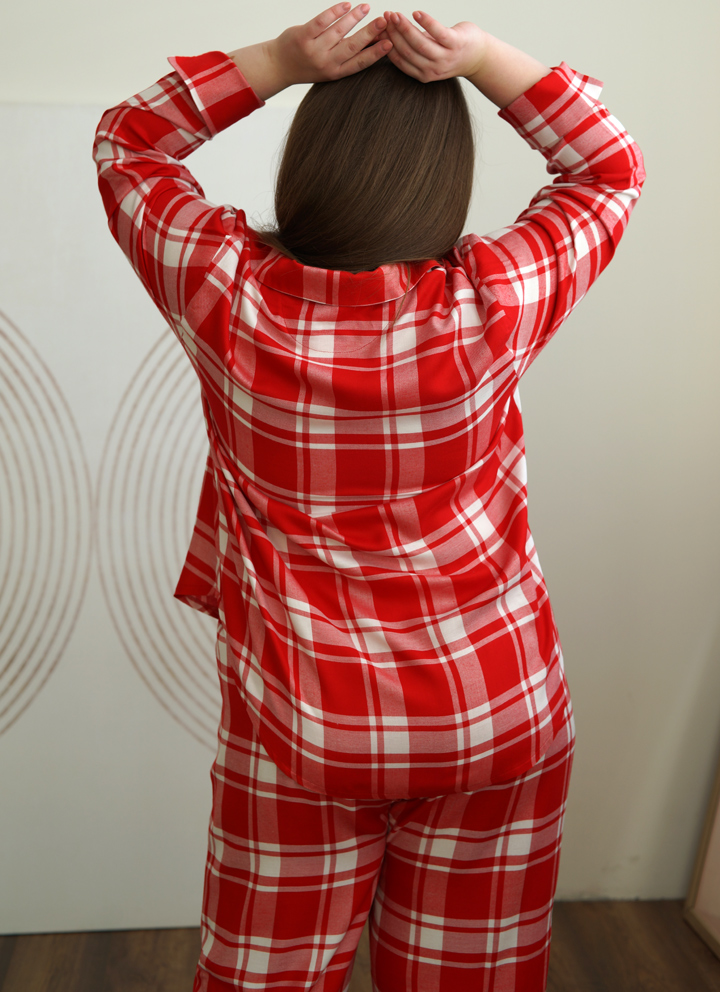Сорочка жіноча червона картата на ґудзиках. Виготовлена з італійської віскози, вона м'яка та приємна на дотик, що робить її ідеальною для носіння вдома та на вулиці.