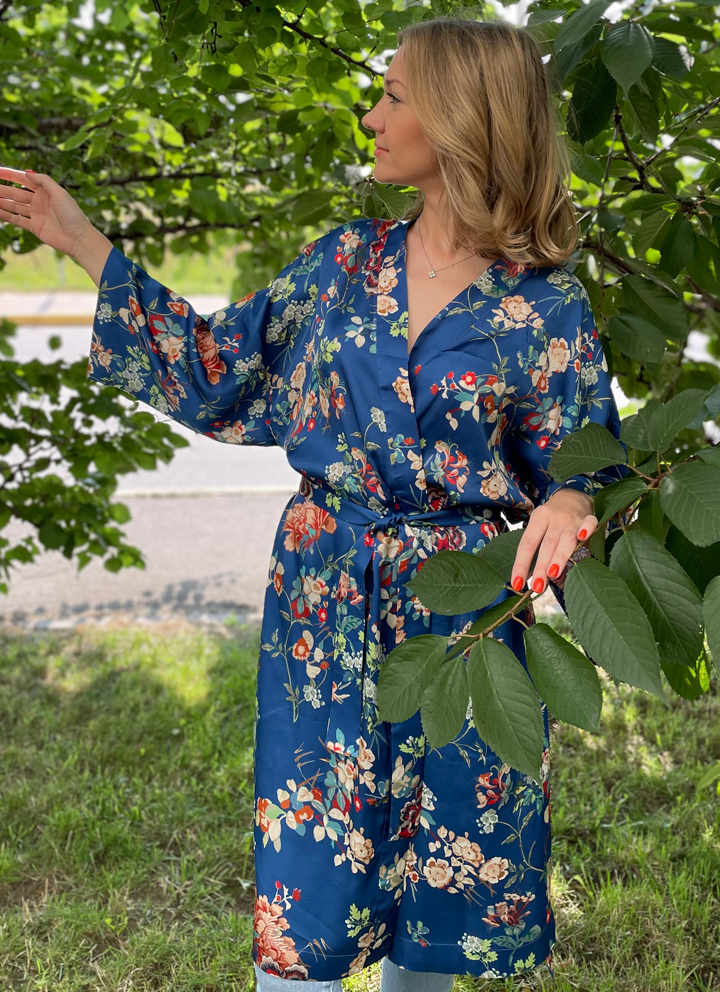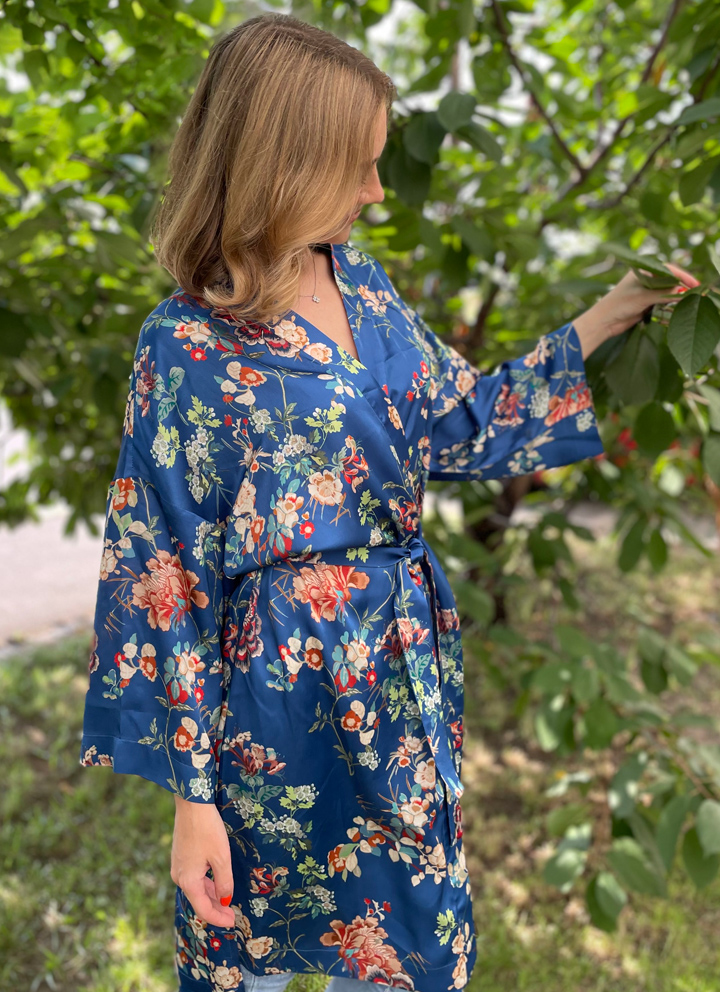 Халат-кімоно на запaх з асиметричним низом на поясі cиній "Ікігай", елегантного крою, з витонченим принтом та ніжністю натурального італійського матеріалу - віскозний шовк.