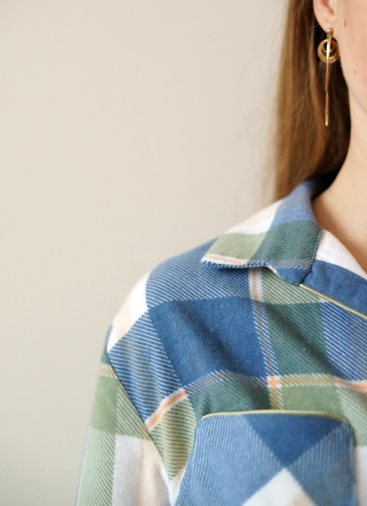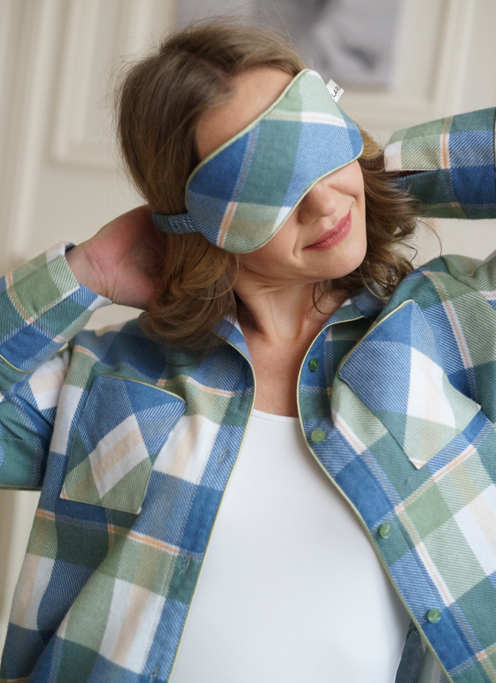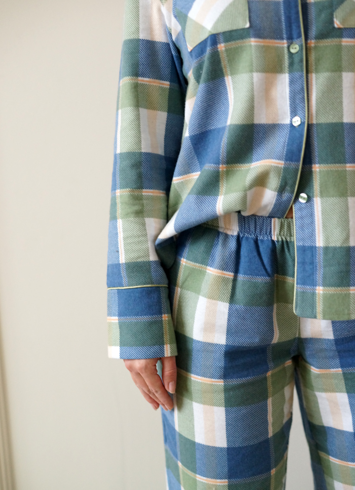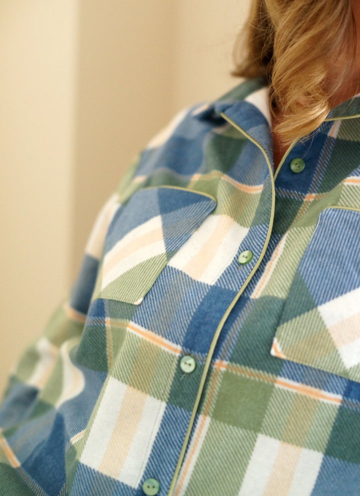 Жіноча піжама з сорочкою - домашній костюм для повсякденного носіння та сну в синьо-зелену клітину з натуральної фланелі. Найкращий варіант для зими та міжсезоння!
