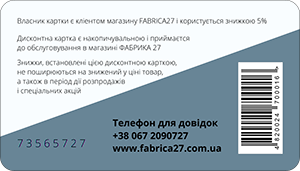 - Знижка 5%. "Відвідувач магазина" стає "Кліентом магазина", коли здійсненює першу покупку, незалено від її вартості і отрумує P.CARD5 на наступні покупки;
